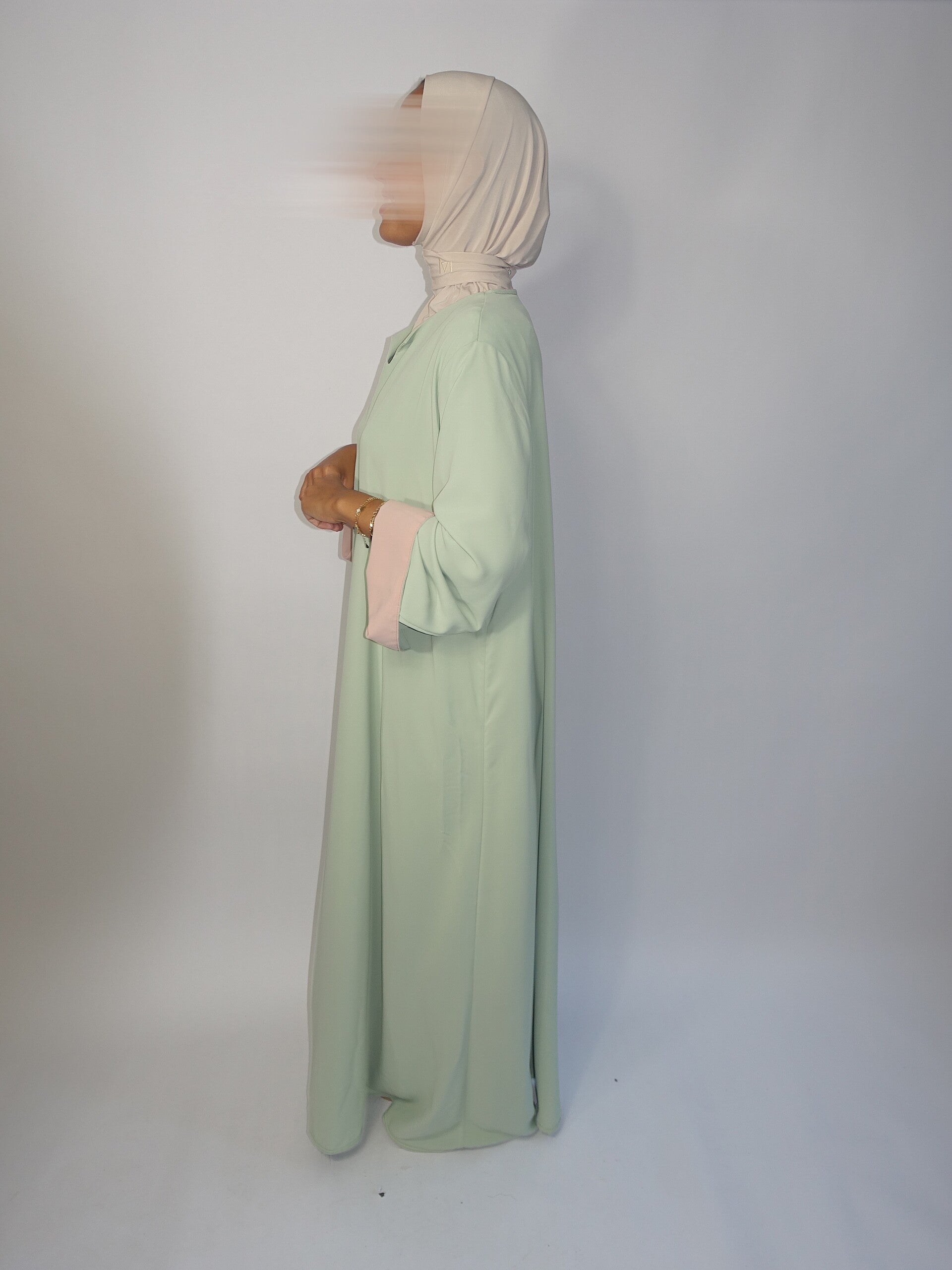 De Mina Abaya straalt pure elegantie en verfijning uit. Met haar minimalistische design en vloeiende pasvorm is deze abaya geschikt voor elke gelegenheid. De mouwen zijn afgewerkt met een contrasterende binnenkleur voor een subtiel en stijlvol detail. De lichte, ademende stof zorgt voor optimaal comfort. Combineer met een bijpassende hijab voor een moeiteloos elegante look.