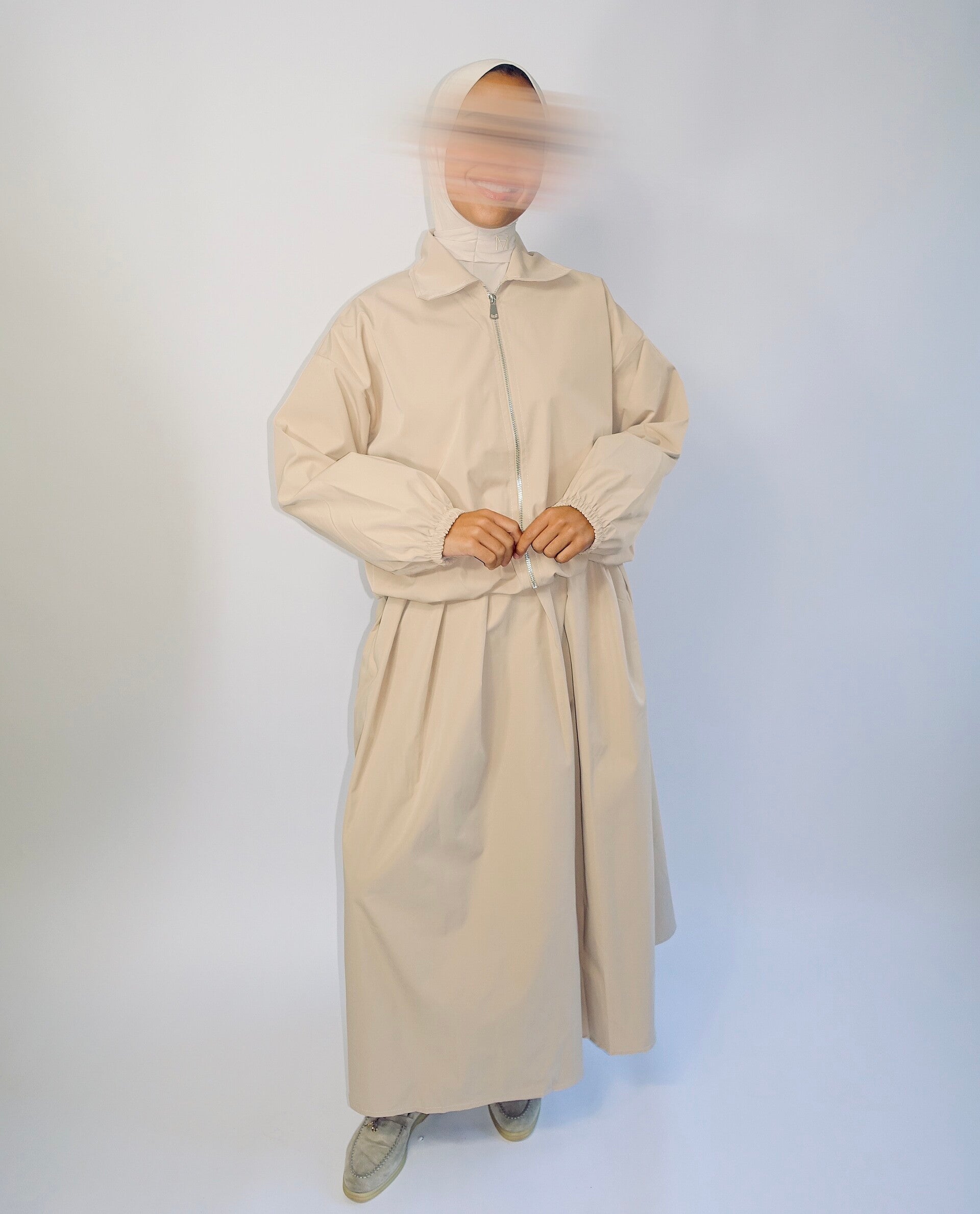 Deze set combineert een eigentijdse bomberjas met een vrouwelijke plooirok voor een moderne, stoere look. De minimalistische jas en wijde rok met plooien maken het zowel casual als chic te stylen.